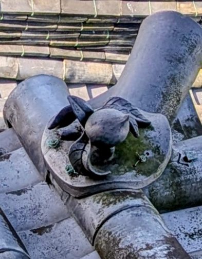 城を厄災や敵兵の侵入から守るための亀の甲羅に桃が乗った魔除けの瓦