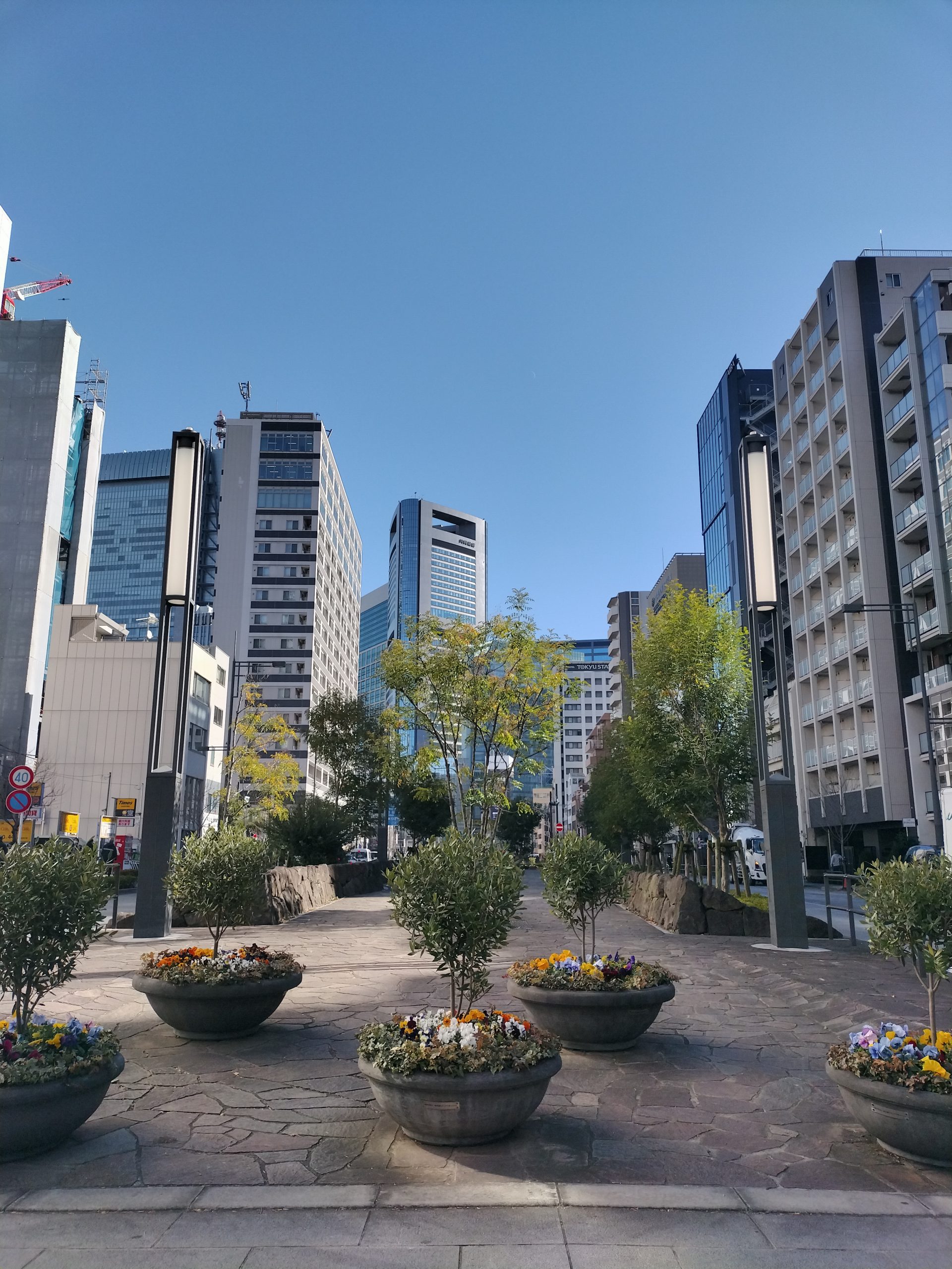 外堀通り(都道405号)と赤レンガ通りが出会うこの交差点から東京湾の方へ向くと遊歩道が有ります。とても良い。