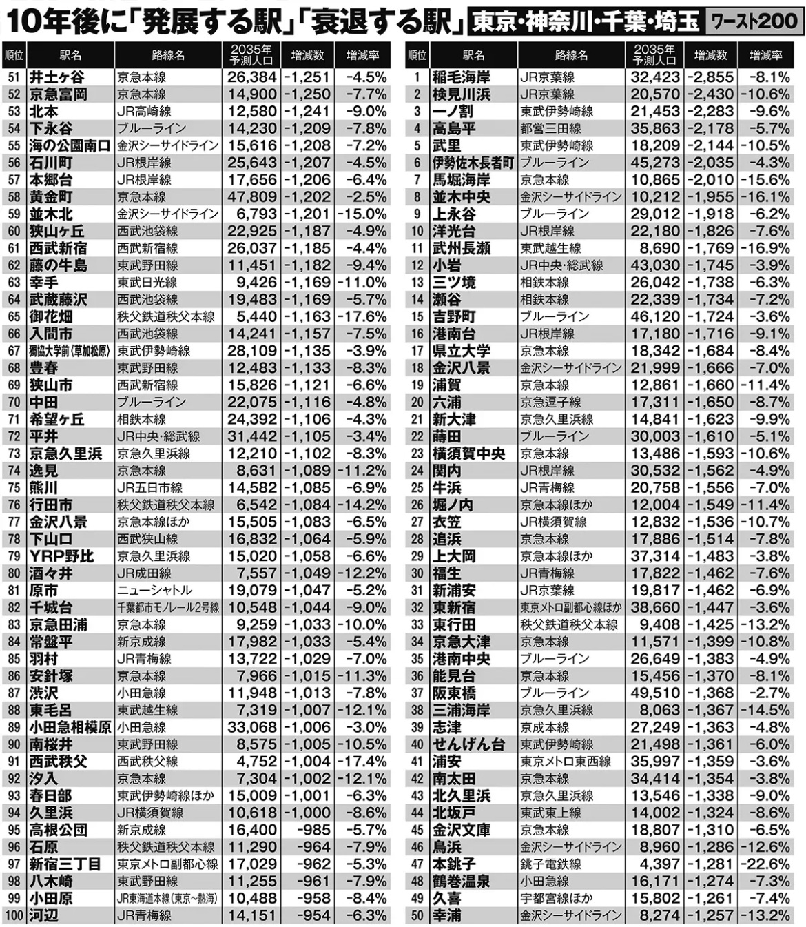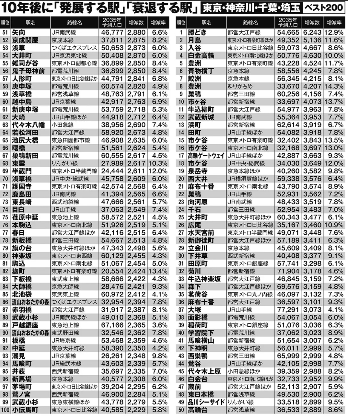 今日は、マネーポスト(週刊ポスト)に掲載されていました2035年の予測人口から「発展する駅」「衰退する街」のランキング200の首都圏分をご紹介します。