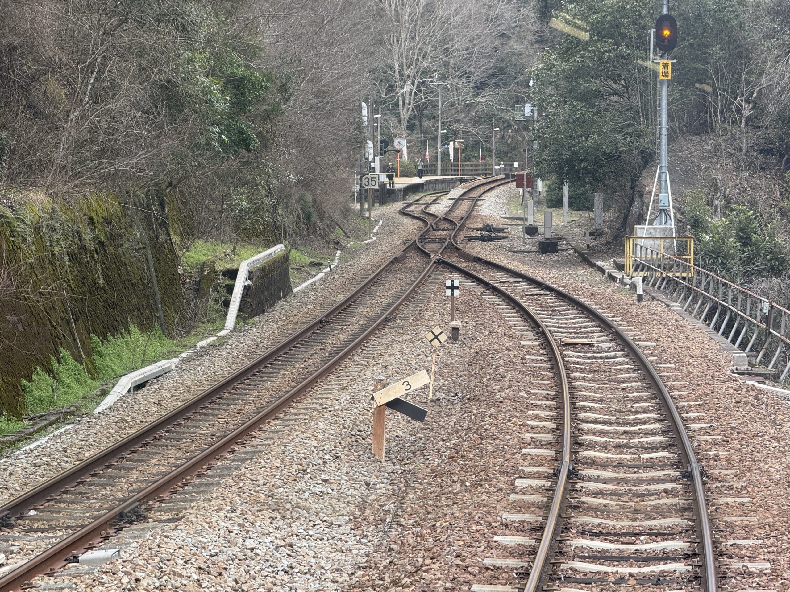 右奥から右手前へ進みスイッチバックでそこからポイントを2箇所通って、左奥の坪尻駅のホームに入線。