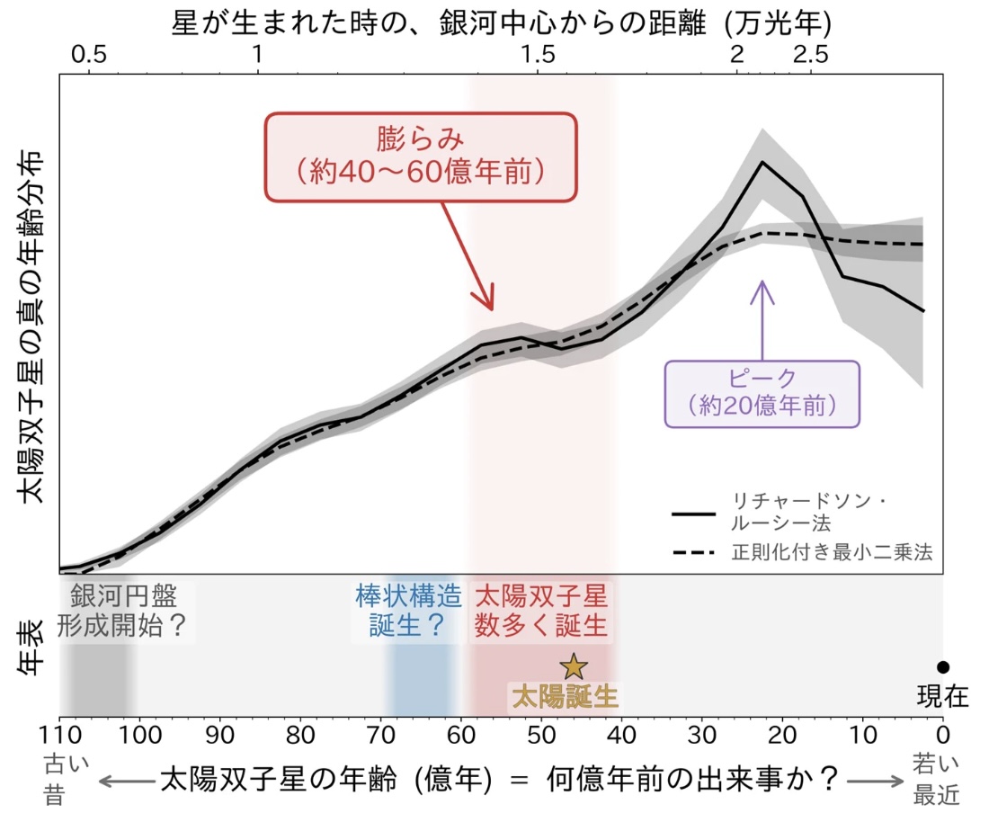 その数はなんと6594個が含まれています。これらは40億歳~60億歳の太陽双子星が数多く含まれており、太陽系の誕生時期(46億年前)と一致します。論文ではこれらは誕生後、天の川の銀河の中心部から外側の棒状構造へ大規模に移動した可能性を提案しています。