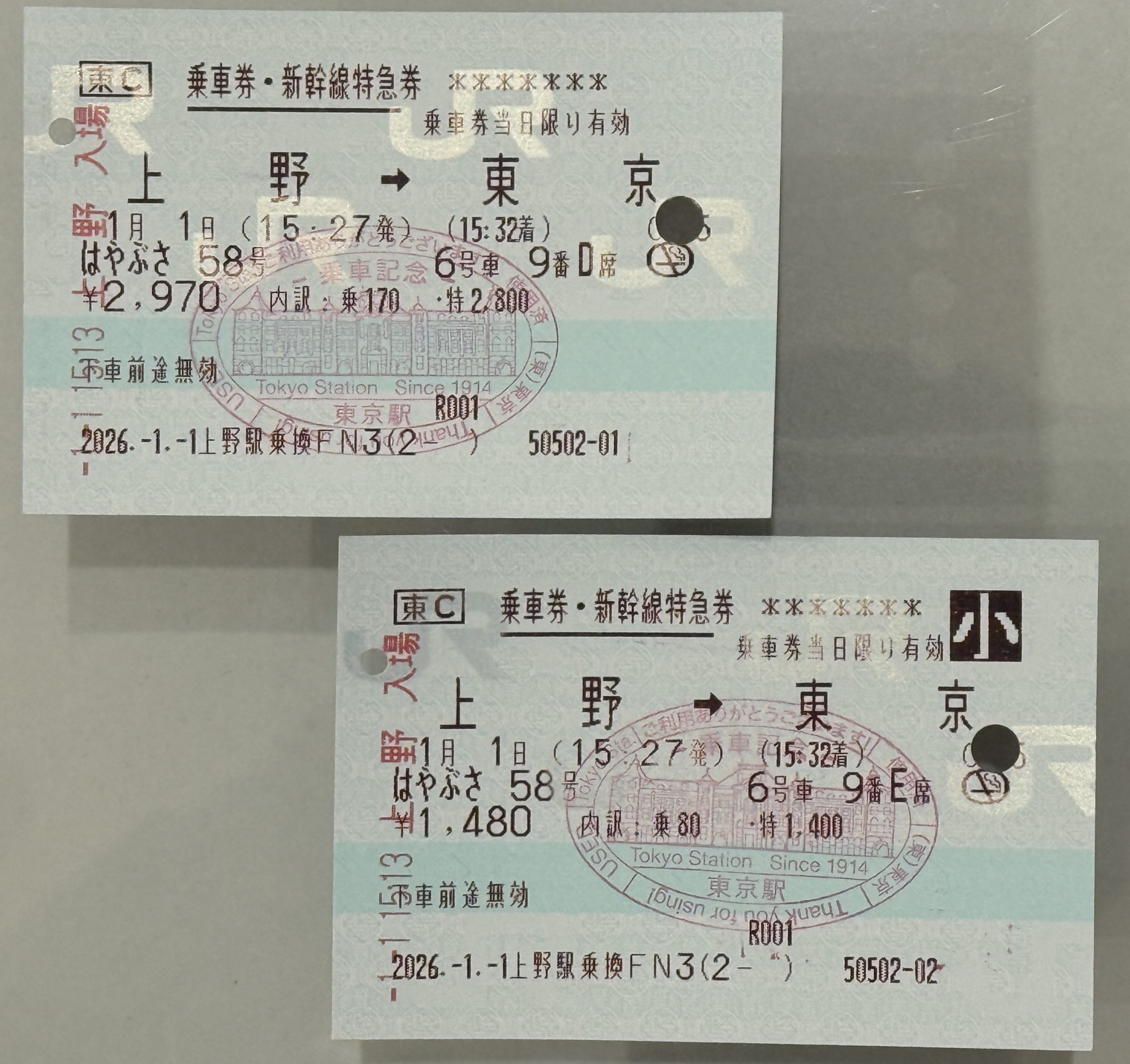 「あのー、上野駅から東京駅までのE5系の新幹線の指定席、大人と小人を、お願いします」